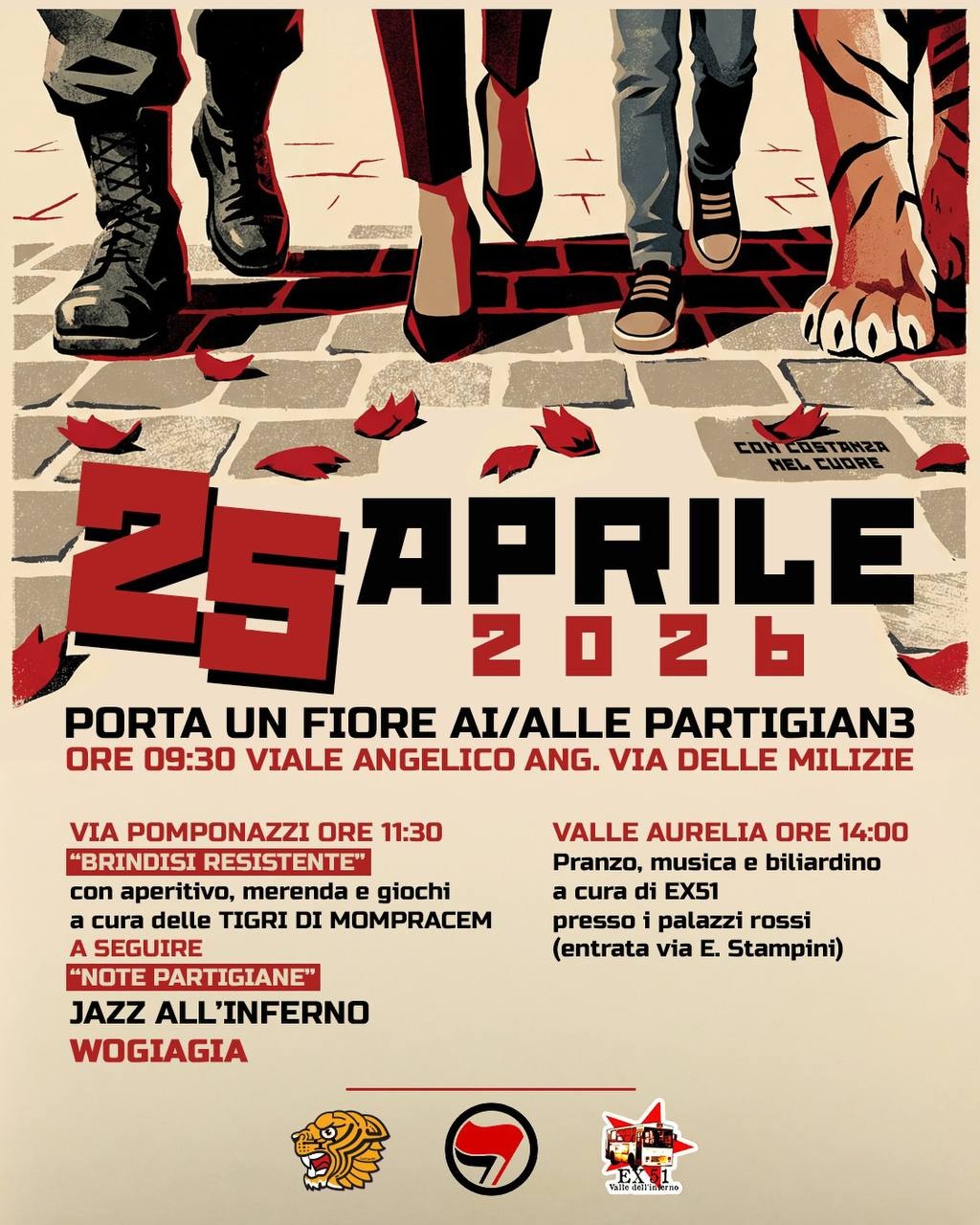 Alle ore 9.30 passeggiata antifascista nei luoghi della Resistenza di Prati (partenza da viale delle Milizie angolo viale Angelico), con omaggio finale alla targa ai partigiani di viaAndrea Doria.