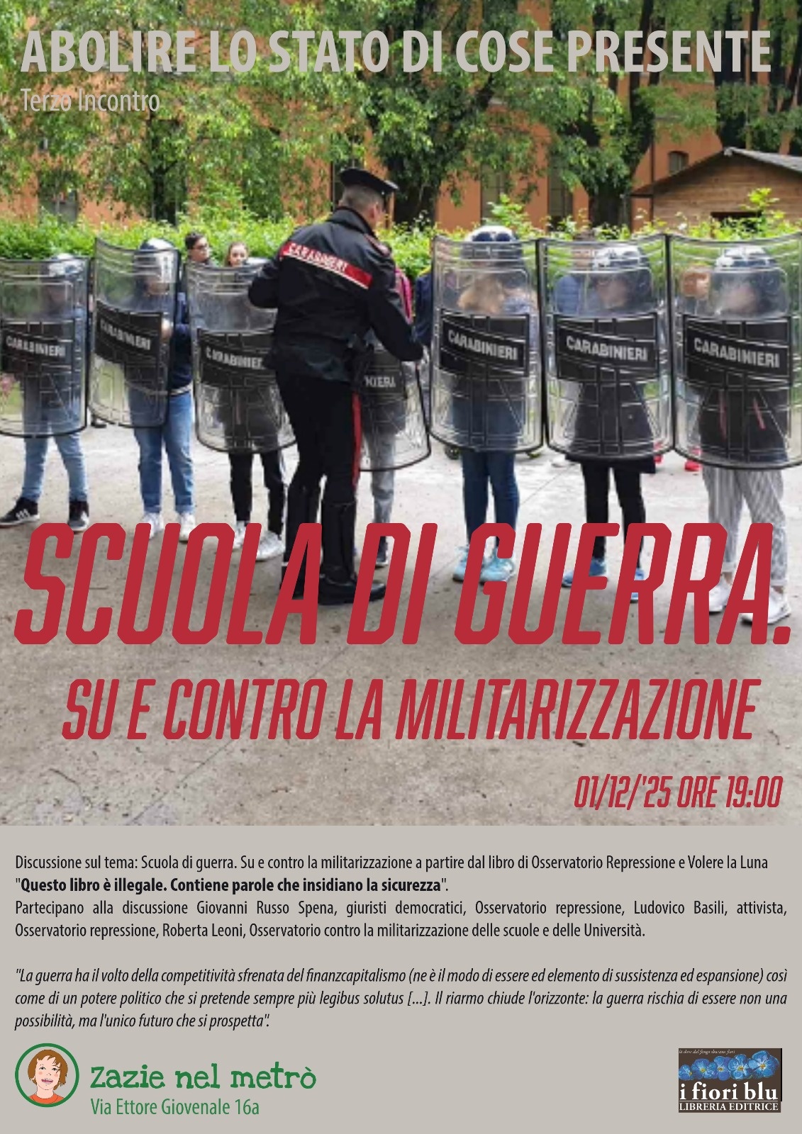 Discussione sul tema Scuola di guerra. Su e contro la militarizzazione a partire dal libro di Osservatorio Repressione e Volere la Luna "Questo libro è illegale. Contiene parole che insidiano la sicurezza". Partecipano alla discussione Giovanni Russo Spena, giuristi democratici, Osservatorio repressione, Ludovico Basili, attivista, Osservatorio repressione, Roberta Leoni, Osservatorio contro la militarizzazione delle scuole e delle Università.