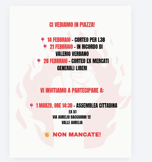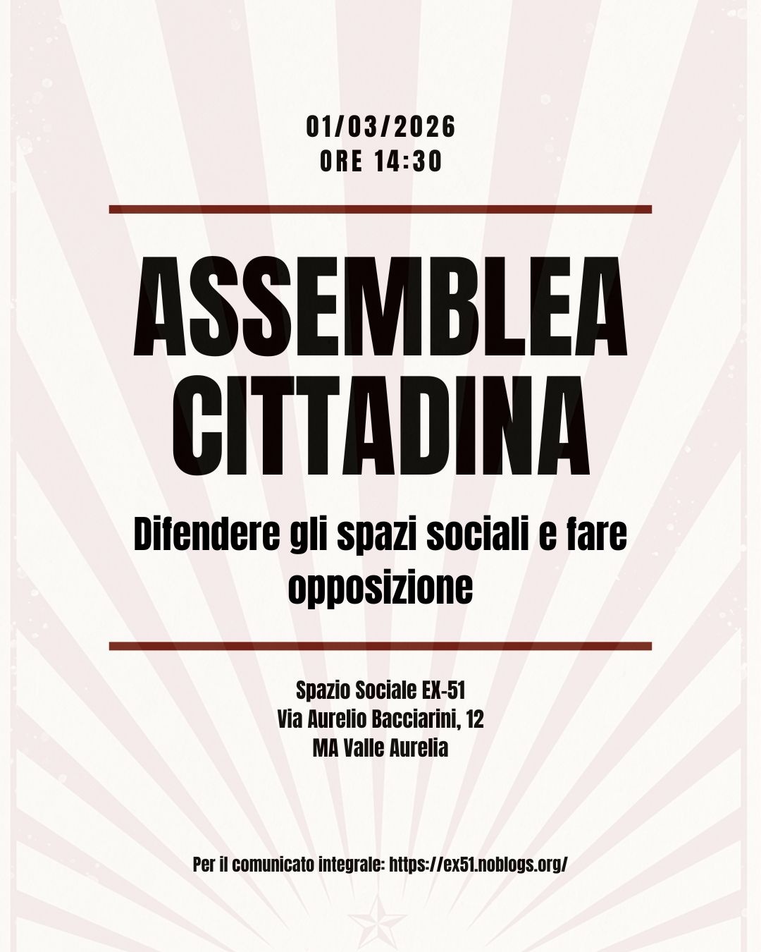 Proprio per questo invitiamo collettivi, percorsi e singole individualità ad un’assemblea per discutere di tutto il I marzo alle 14:30 presso il nostro spazio in via Aurelio Bacciarini, 12, Valle Aurelia.