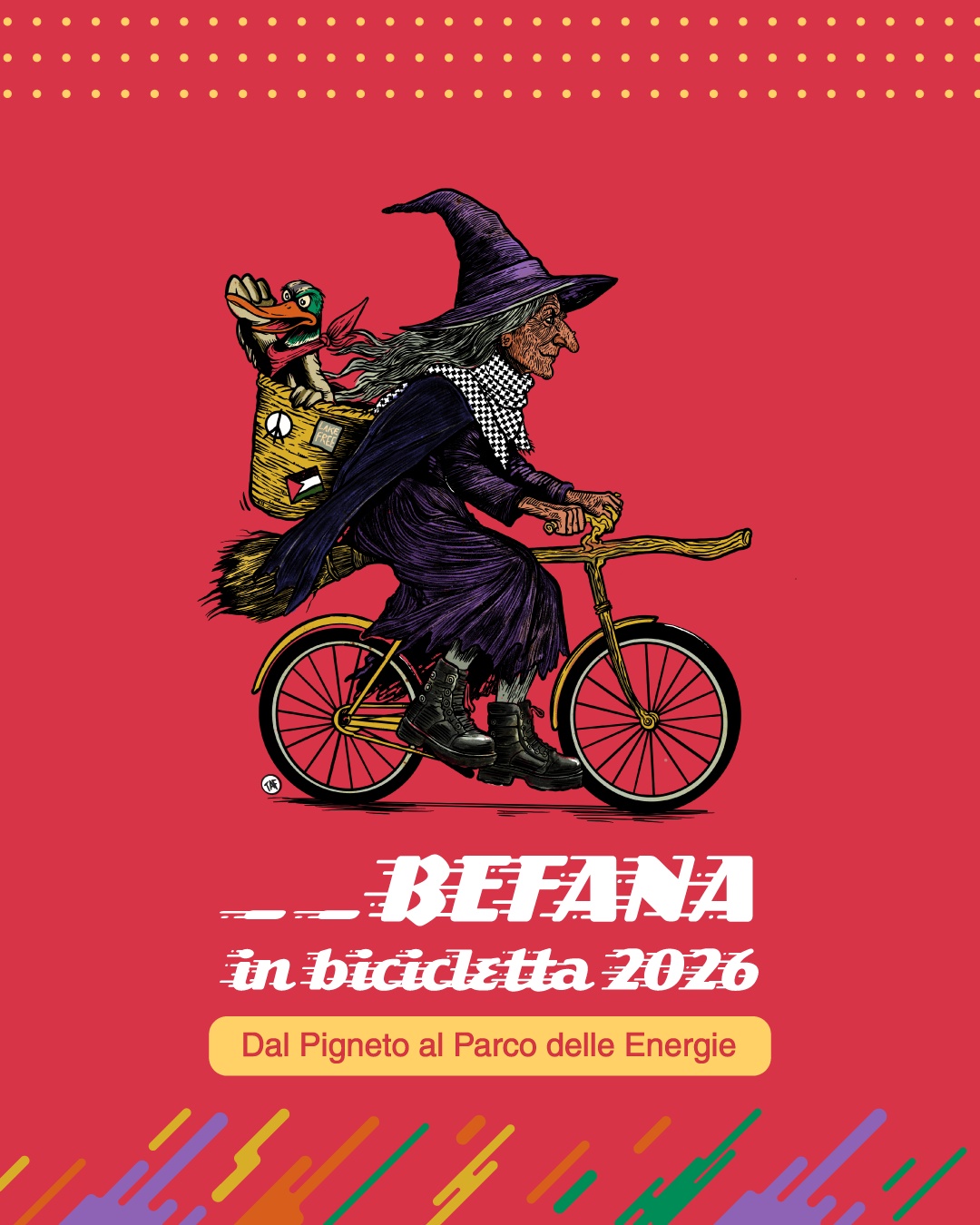 Vieni in bicicletta, con i pattini, sul monopattino, a piedi o in carrozzina, con un paio di scarpe anche rotte, per accompagnare la Befana tra le vie del quartiere, a portare carbone a chi se lo merita e spazzare via con la sua scopa le guerre e ogni ingiustizia, l'ignoranza e la prepotenza!