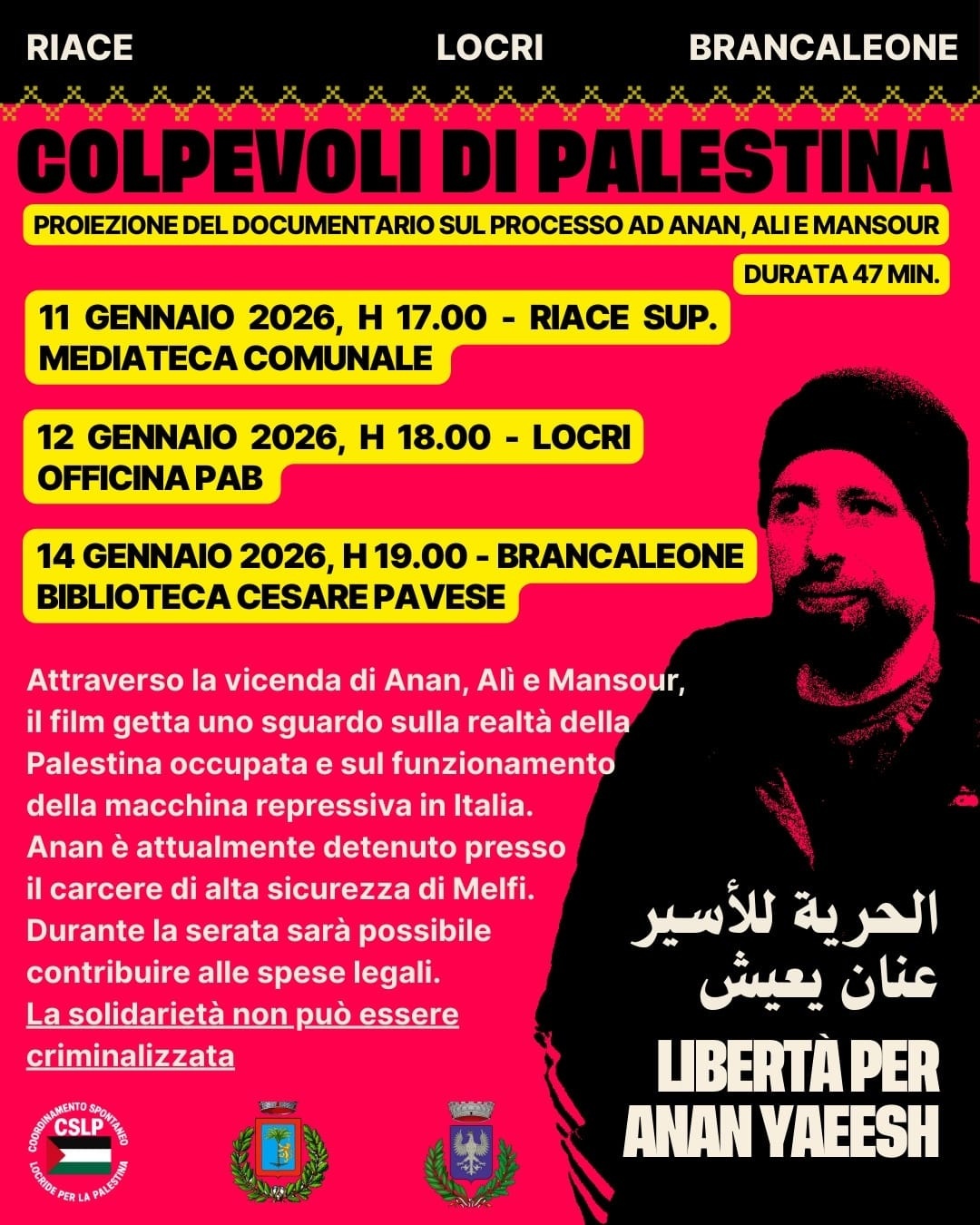 ci incontriamo per la proiezione del documentario “Colpevoli di Palestina”, che ricostruisce la vicenda giudiziaria di Anan Yaeesh, detenuto nel carcere di alta sicurezza di Melfi.