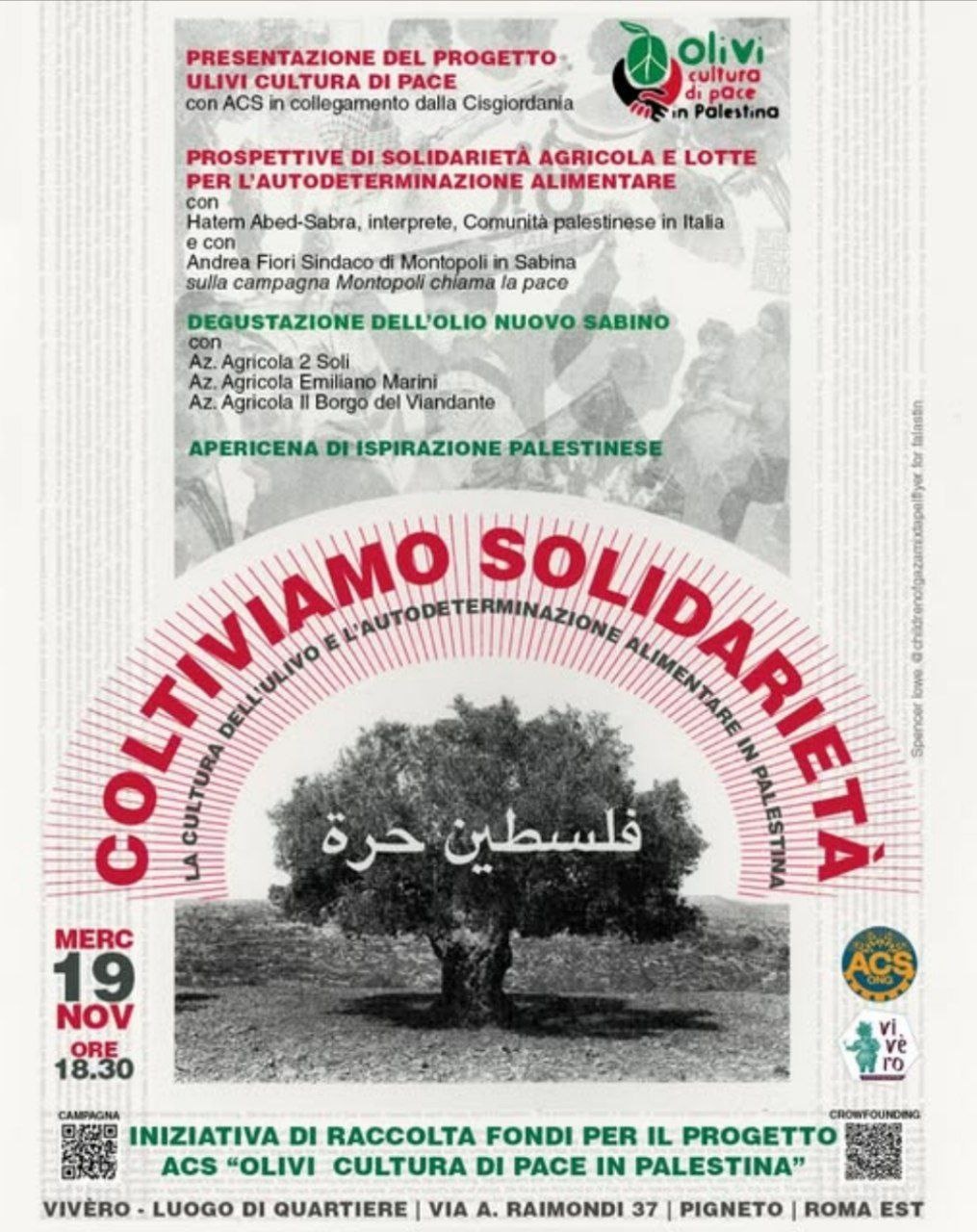 Prospettive di solidarietà agricola e lotte per l'autodeterminazione alimentare con Hatem Abed-Sabra, interprete, Comunità palestinese in Italia e con Andrea Fiori Sindaco di Montopoli in Sabina sulla campagna Montopoli chiama la pace