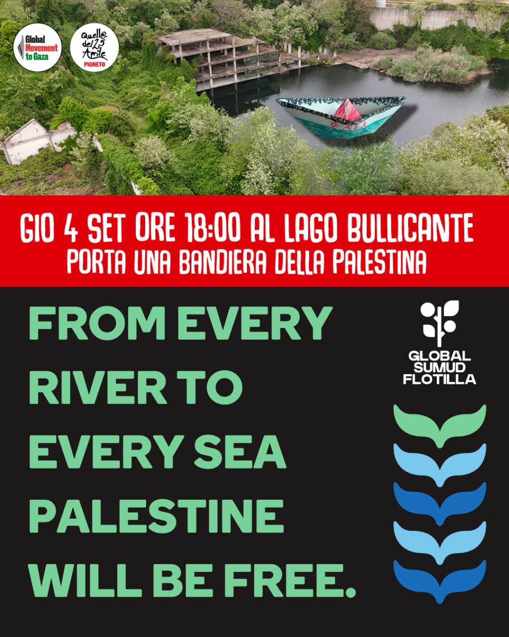 ORE 18:00, ci troveremo al Lago Bullicante Ex Snia (Via di Portonaccio 230) per un presidio pubblico sulle sponde del lago che combatte contro le ingiustizie, l'acqua ricorda e ci unisce alla flotta che si prepara ad attraversare il mediterraneo per portare cibo a Gaza.