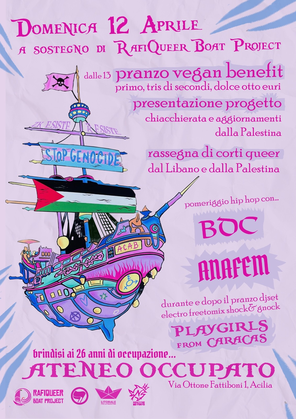 Domenica 12 aprile ci vediamo per una giornata di solidarietà e sostegno alla RafiQueer Boat Project. In un momento in cui genocidio, occupazione e repressione continuano, costruiamo dal basso pratiche concrete di supporto, informazione e condivisione.