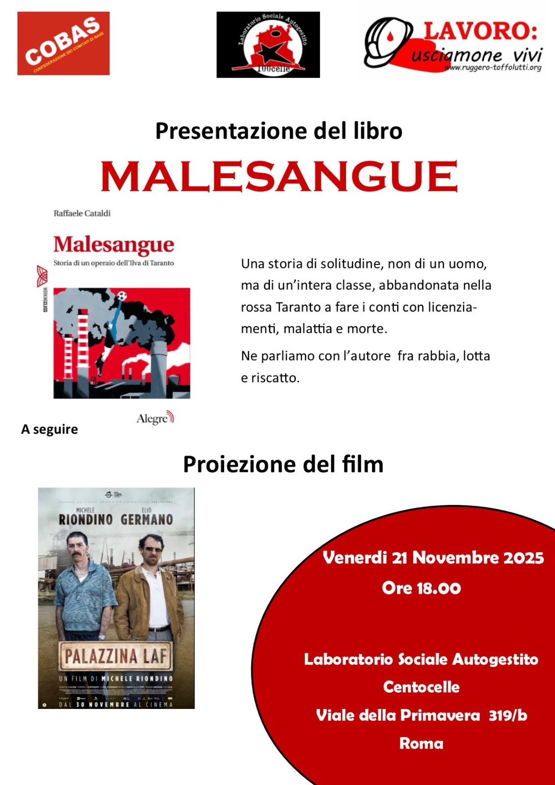 L' Associazione nazionale per la sicurezza sul lavoro "Ruggero Toffolutti" in collaborazione con i Cobas e il Laboratorio Sociale Autogestito 100celle invitano tutti e tutte ad ascoltare Raffaele Cataldi, operaio Ilva che nel suo libro "Malesangue" racconta la lunga battaglia di chi a Taranto non vuole cedere al ricatto occupazionale, non delegando ma agendo in prima persona, perchè non si può scegliere tra salute e lavoro. A seguire ci sarà la proiezione del film "Palazzina LAF" di Michele Riondino, tratto dal libro "Fumo sulla città" di Alessandro Leogrande, giornalista tarantino scomparso nel 2017.