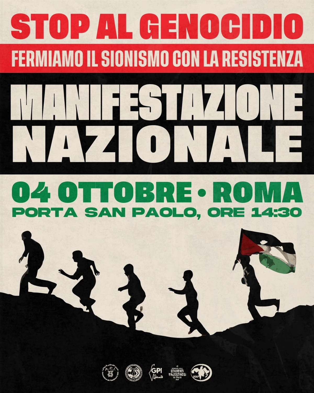Il 4 ottobre 2025 scendiamo in piazza per una grande manifestazione nazionale. Saremo in piazza per sostenere il nostro popolo e il nostro movimento di liberazione, per onorare gli oltre sessantamila martiri di Gaza e i suoi combattenti, che da due anni resistono instancabilmente all’aggressione sionista. Saremo in piazza per tutta la Palestina, che da oltre un secolo si oppone all’occupazione e al progetto coloniale sionista.