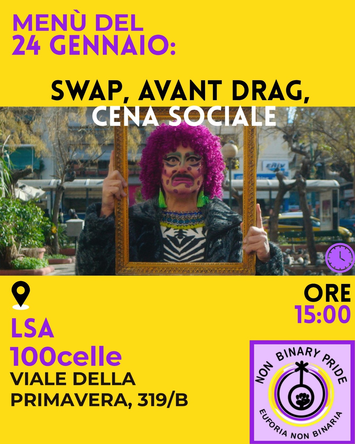 H 15:00 - iniziamo con un swapqueerparty (porta qualche abito che hai voglia di scambiare e ricordati di etichettarlo con il tuo nome e con una di queste tre parole: dono (se vuoi comunque lasciarlo), cambio (se lo cambi con altro capo), presto (se vuoi lasciarlo a disposizione per la sfilata ma vuoi riportarlo a casa)