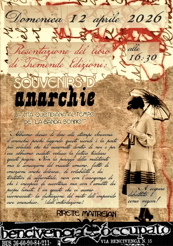 Presentazione del libro a cura di Tremende Edizioni, a seguito dibattito e cena vegan. Per maggiori informazioni sul libro, visitate https://bencivenga15occupato.noblogs.org/post/2026/04/04/12-aprile-presentazione-del-libro-souvenirs-danarchie-di-rirette-maitrejean/