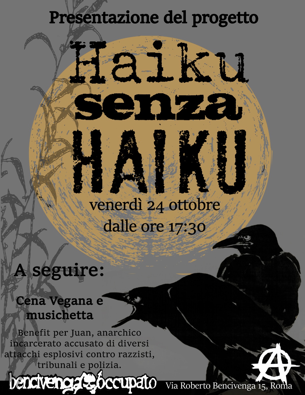 Presentazione a cura di unx compagnx del progetto Haiku senza Haiku, poesie (e non solo) in solidarietà al prigioniero anarchico Juan Sorroche, incarcerato in AS2 a Terni con l'accusa di diversi attacchi esplosivi contro razzisti, tribunali e polizia. A seguire cena vegana e musichette, tutto benefit per Juan.