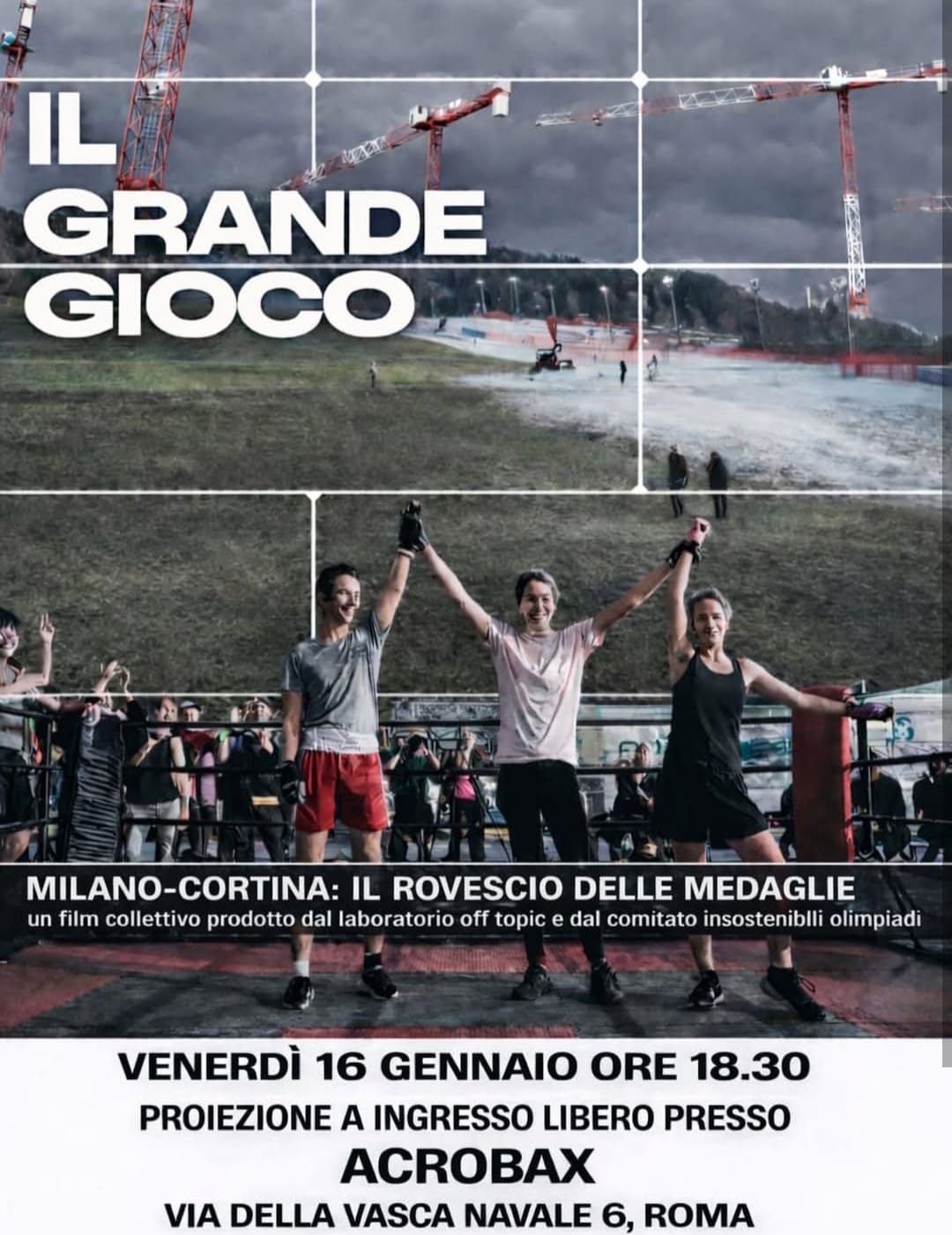 La polisportiva Alla Reds insieme a La popolare, palestra indipendente sono liete di presentare la prima romana de "Il grande Gioco", film collettivo prodotto da Off Topic e C.I.O sulle imminenti Olimpiadi invernali di Milano Cortina e relativi disastri. Si inizia con una breve presentazione e l'avvio della proiezione, si prosegue con un dibattito aperto a tutte le realtà sportive e popolari della capitale, si chiude con un'apericena a sostegno delle prossime iniziative degli All Reds basket. Presenti banchetti, birrette e musica durante la serata.