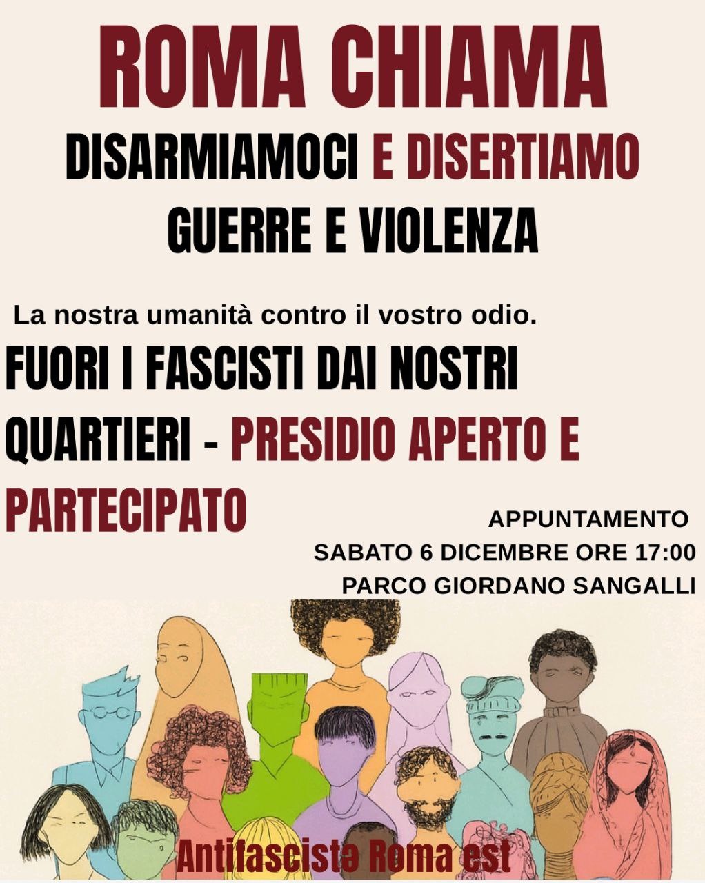 È arrivata notizia che sabato 6 dicembre alle 18, al Parco Sangalli di Torpignattara, Forza Nuova ha convocato una manifestazione con il solito pretesto della “difesa di Roma”: una narrazione tossica, costruita per alimentare paura, razzismo e divisioni, come già visto in altre loro iniziative, comprese quelle legate alla retorica della cosiddetta “remigrazione”.