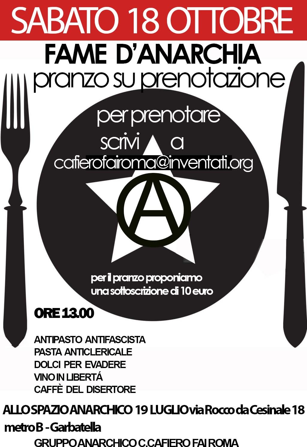 Sabato 18 ottobre 2025 a partire dalle ore 13:00 ci sarà il prossimo pranzo su prenotazione Fame d’Anarchia allo Spazio anarchico 19 Luglio in via Rocco da Cesinale 18 a garbatella. Un appuntamento aperto di convivialità, incontro e diffusione di stampa anarchica. Per l’occasione potremo condividere le proposte, le iniziative messe in campo e che intendiamo sostenere nel prossimo futuro per la Campagna Lo Spazio anarchico 19 Luglio non si chiude.