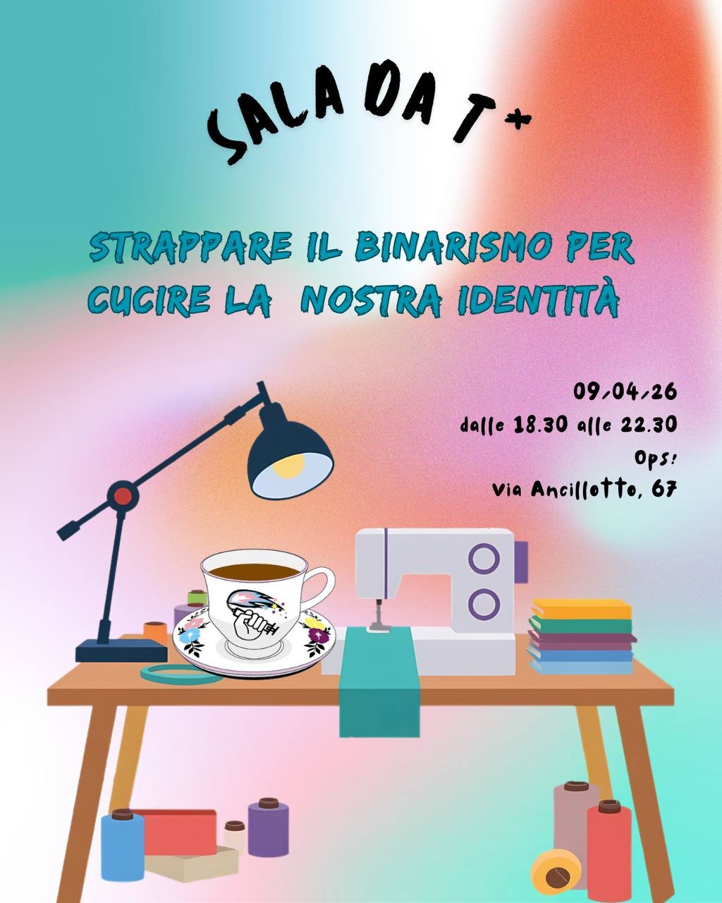 ☕️ In Sala da T* puoi rilassarti, fare chiacchiere con altre persone trans, cucire vestiti, prendere nuovi vestiti, guardare altre persone creare, fare l'uncinetto, mangiare patatine. Porta la tua pratica T di modifica dei vestiti!