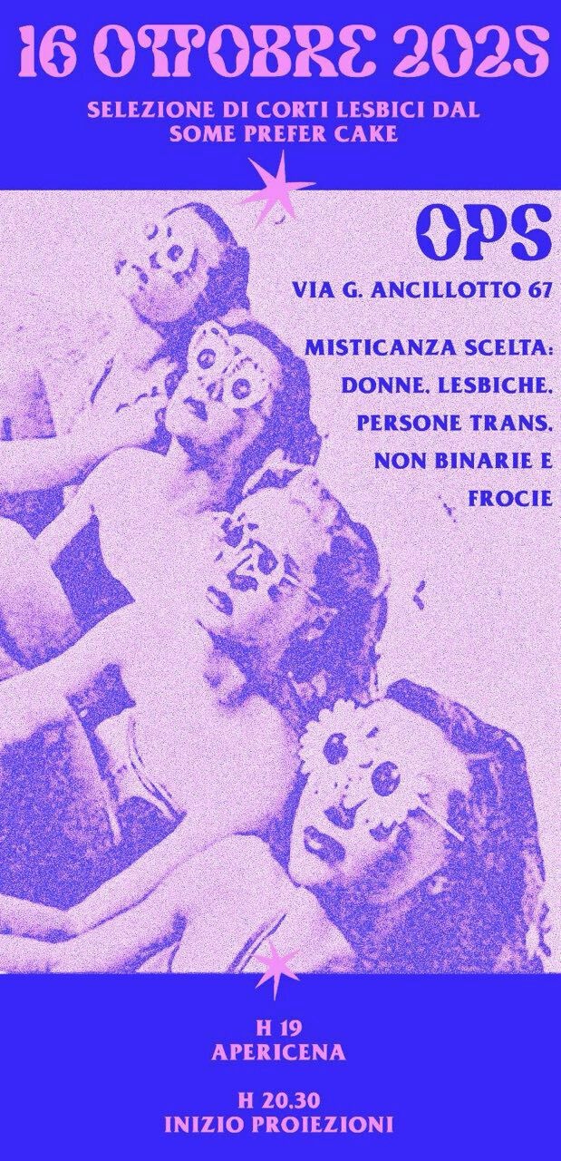 Anche quest'anno OPS! riapre l'anno di lotta con una selezione di corti lesbici da Some Prefer Cake, il festival internazionale di cinema lesbico giunto alla sua XVII edizione, tenutasi a Bologna dal 19 al 21 settembre. Ci vediamo alle 19 per un apericena e alle 20.30 proietteremo una selezione di corti in un numero variabile tra 7 e 9.