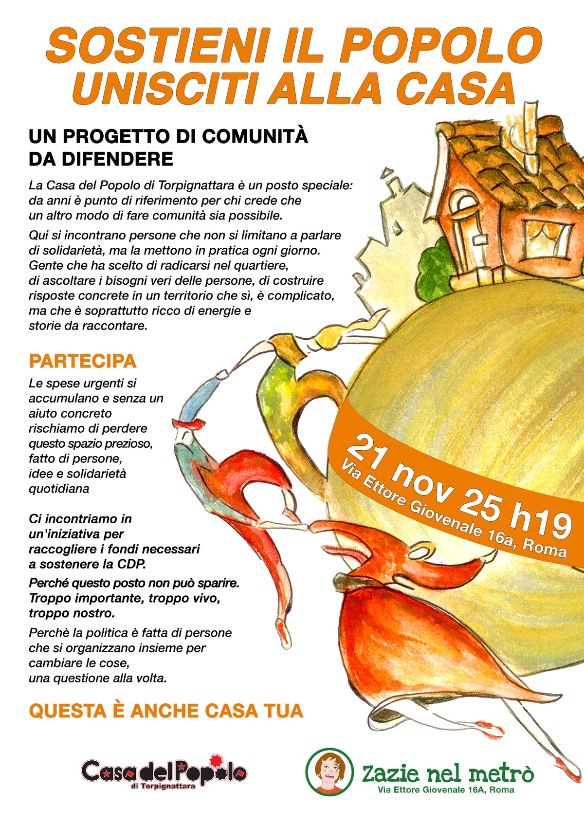 Il 21 Novembre alle ore 19:00 da Zazie nel Metrò serata benefit a supporto della Casa Del Popolo di Torpignattara.